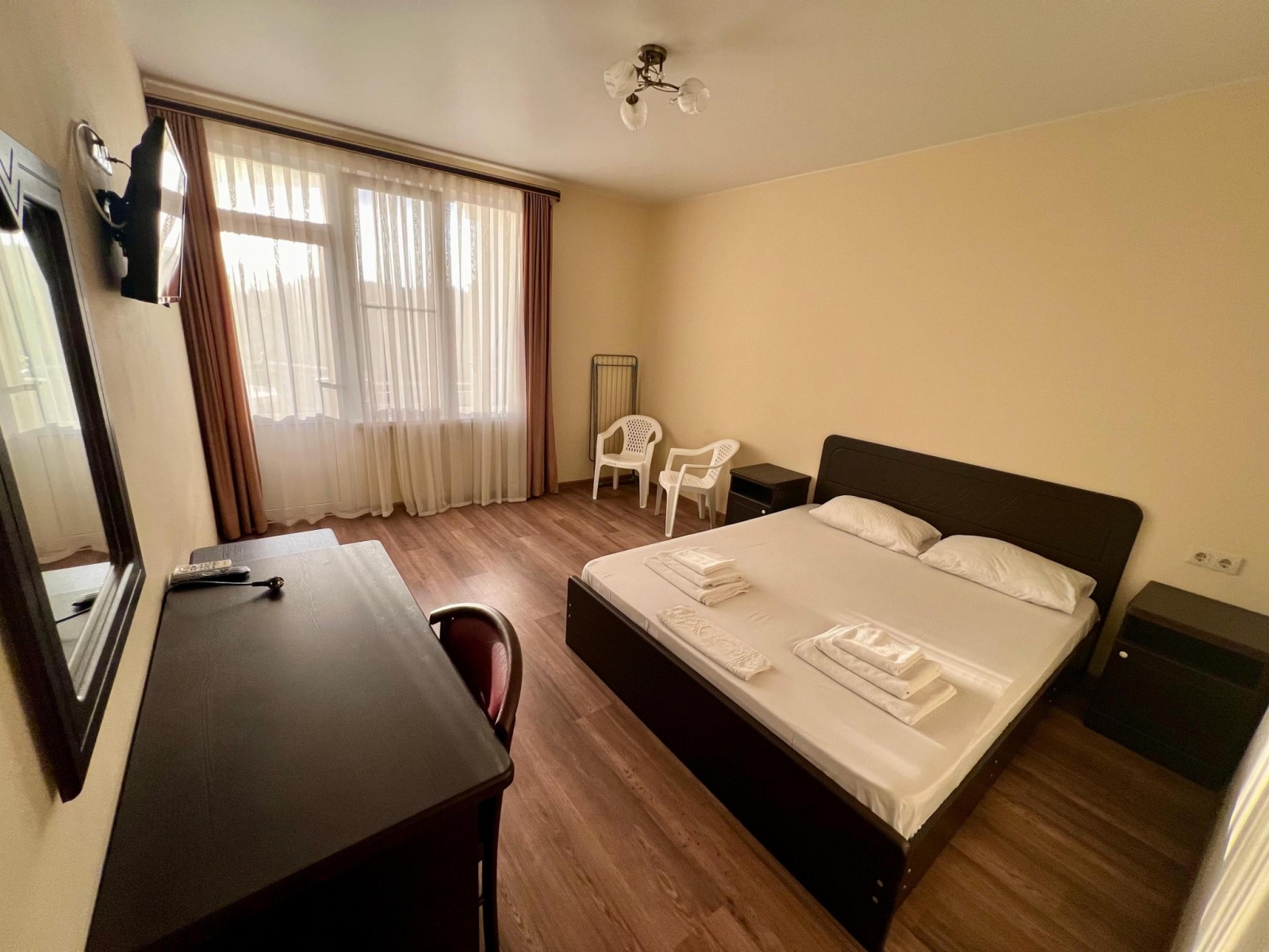 Просторный двухместный номер с большой кроватью, оснащён всем необходимым для комфортного отдыха. В распоряжении гостей сан узел с душем и банными принадлежностями, телевизор, холодильник, фен, чайник, бесплатный Wi-Fi.